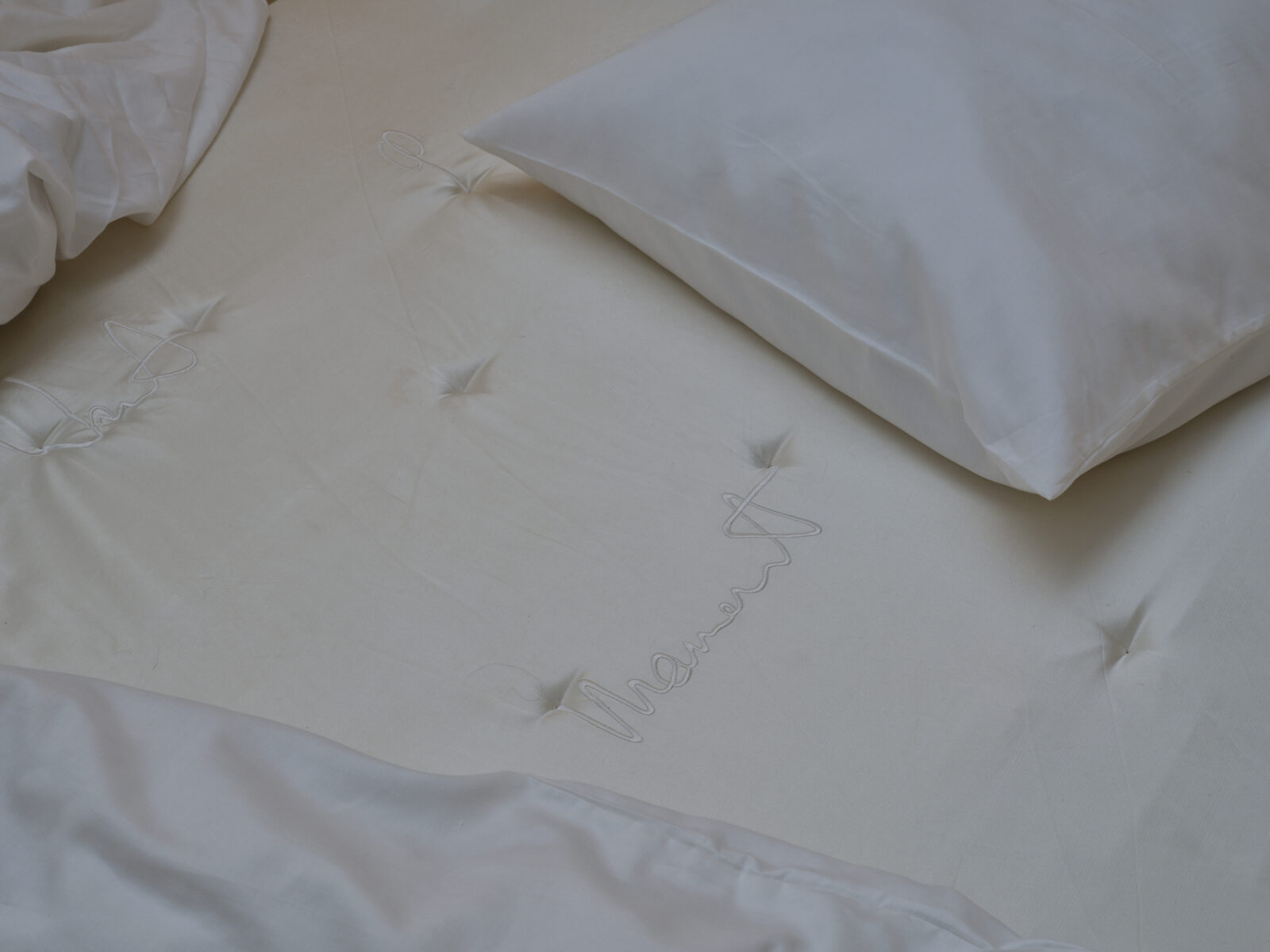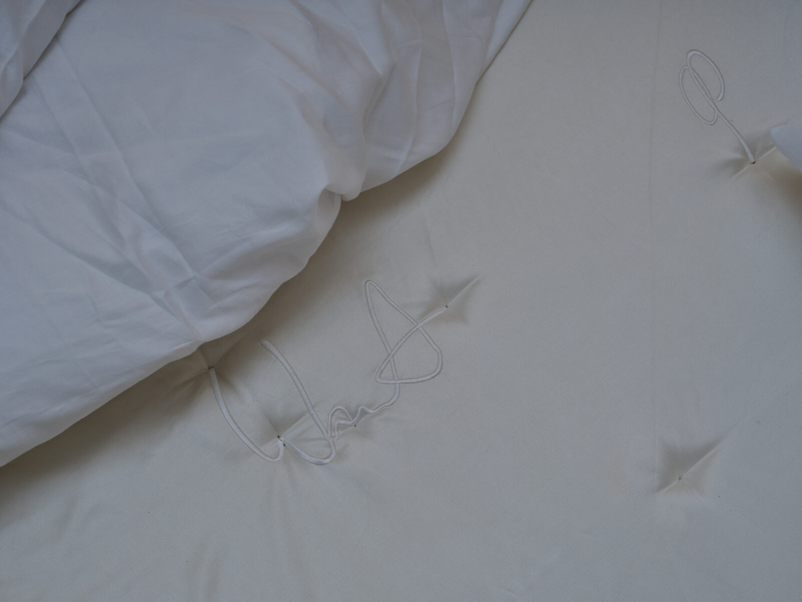 After the successful Antwerp edition of The Restore-rant, an intimate performance dinner by Michelle Woods and Anne Kluytenaar, the event was held in Garage Rotterdam in the summer of 2024. In different thematic rooms, visitors were invited to discuss topics that are not always easy to talk about in everyday life, such as gender, sexuality and self-image. For a bedroom where guests could lie on a bed and talk to each other in an intimate setting, Kluytenaar asked the TextielLab to embroider a mattress cover.
