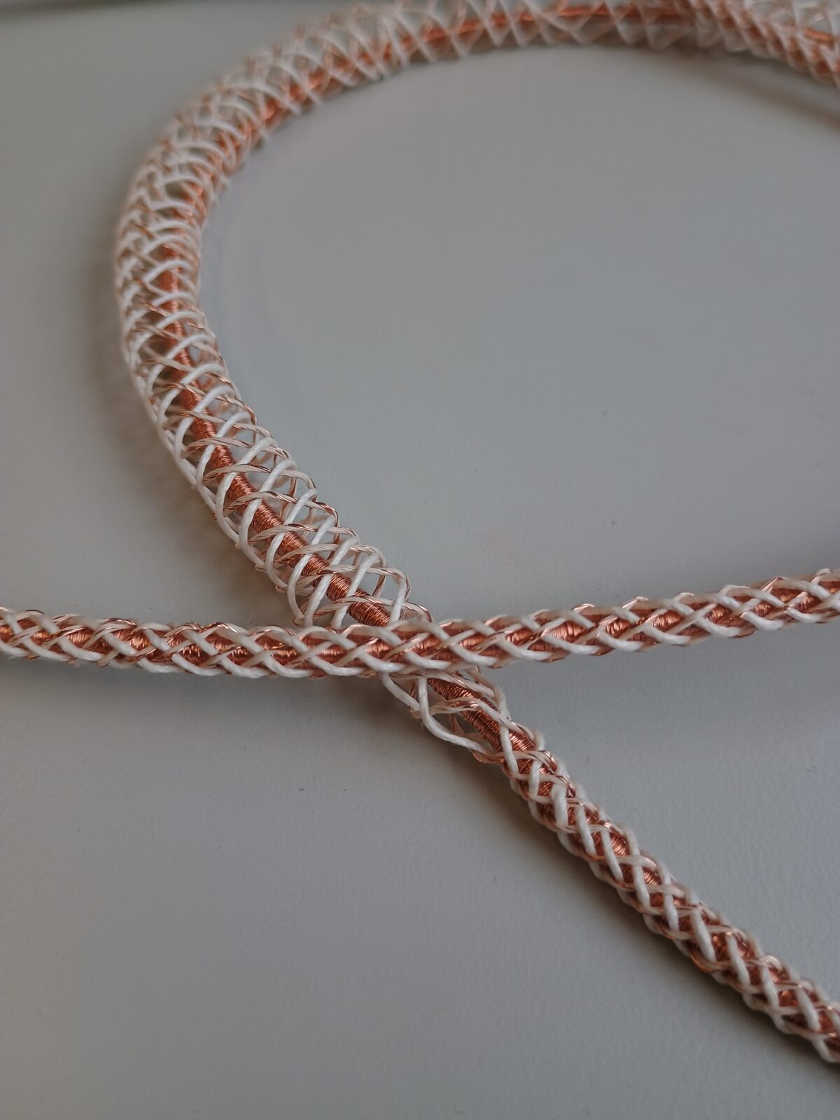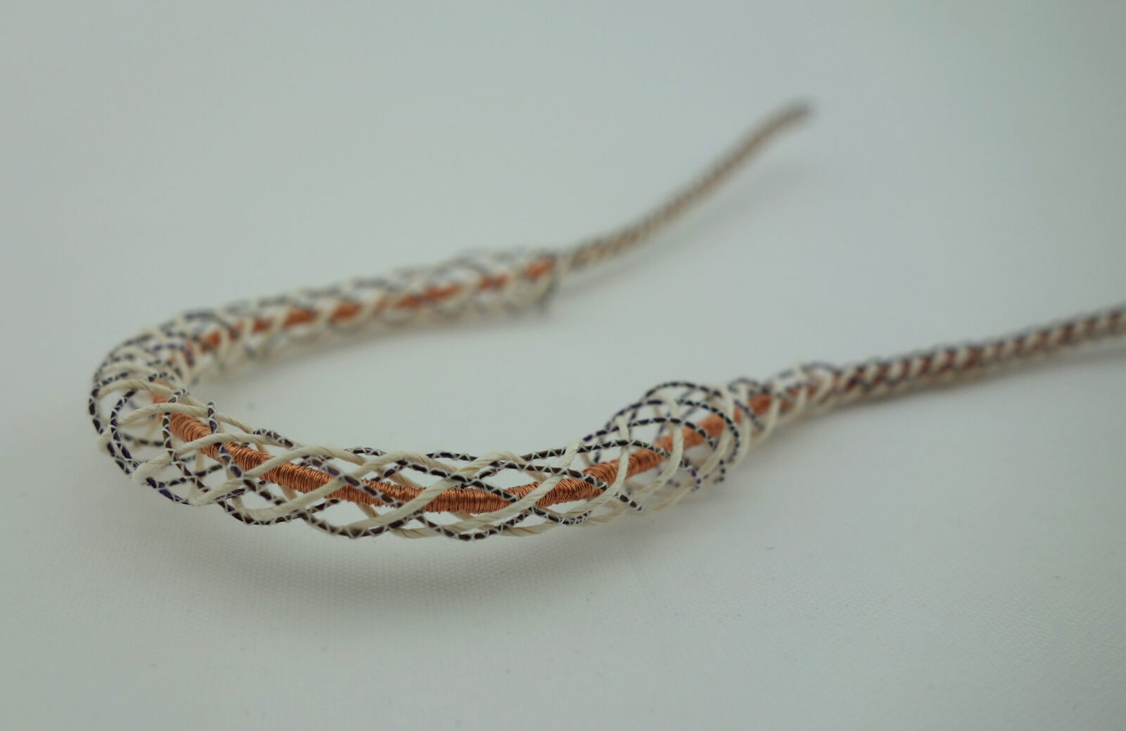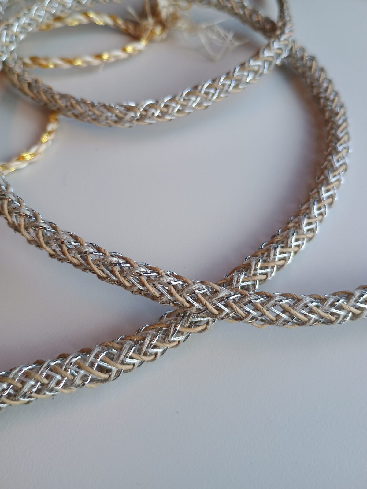 How do jewellery and textiles blend to create a new art form? With passementerie expert Elian Beeker, Bertels experimented with gimped, twisted and braided cords in which sustainable natural yarns were combined with recycled and precious metal. For example, shiny copper thread was covered with an open structure of paper yarn, linen, hemp or hand-made banana yarn. Lightly moistening these fragile yarns made them easier to work with, making it possible to ‘refine’ textiles. The results were shown in the ‘Future Generation’ exhibition at MAD Brussels in 2024.