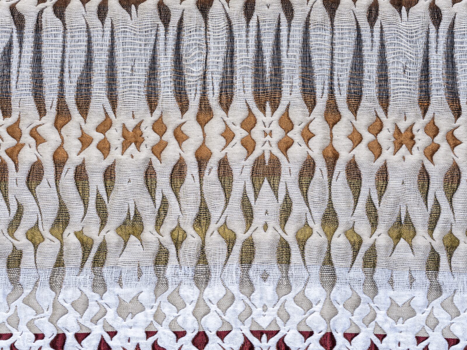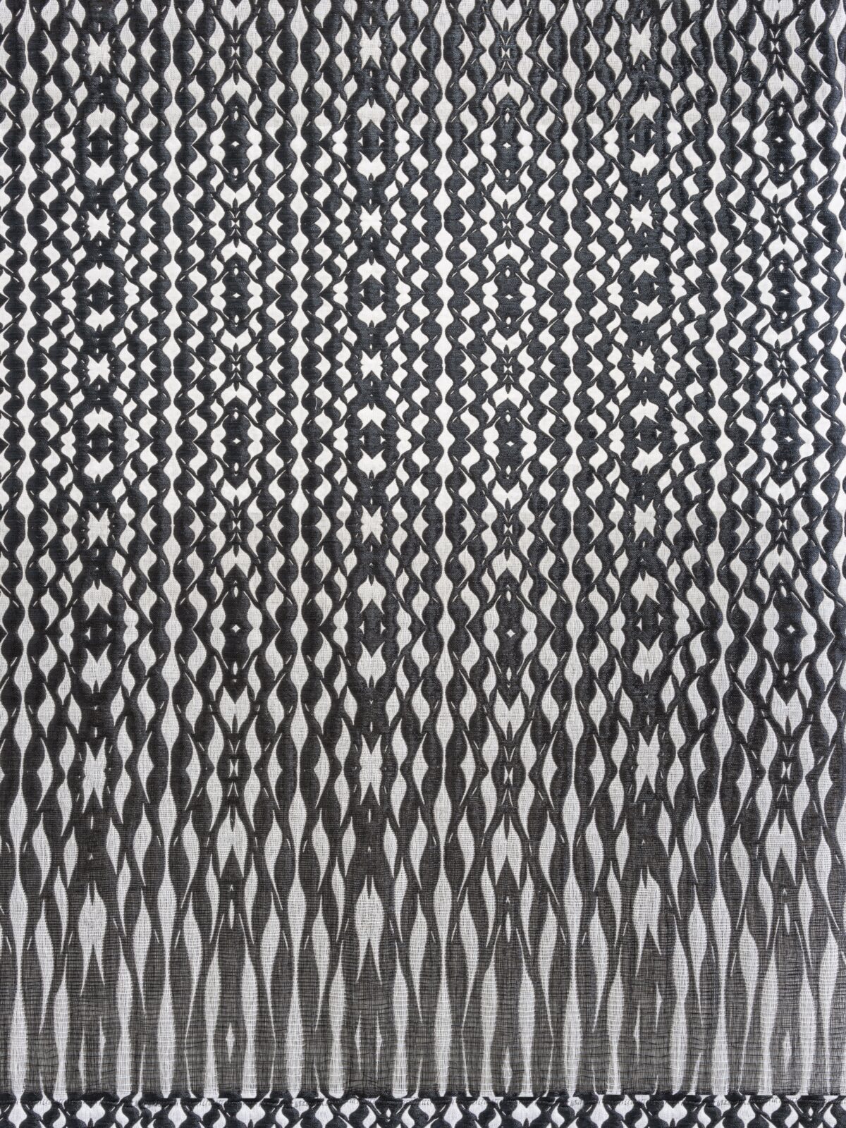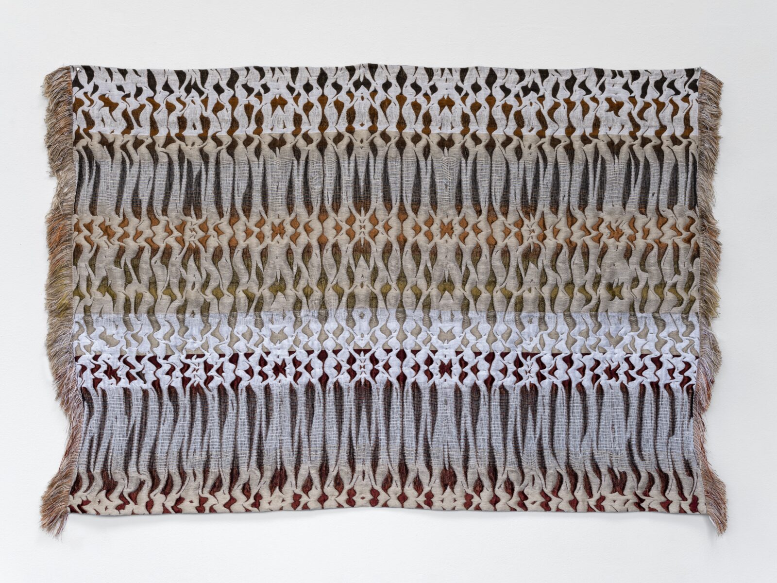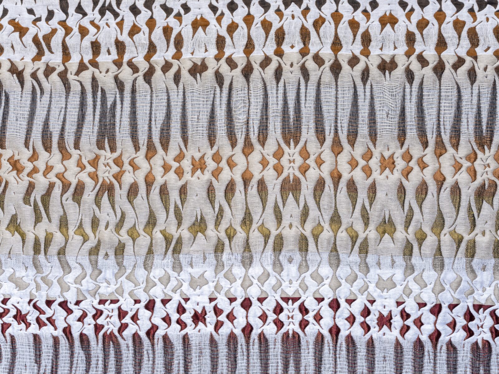 The tapestries play with the patterns of the falcon’s plumage. The imposing black and white tapestry, which measures 180 x 250 cm, is woven from linen, organic cotton and viscose. By varying the density of the fabric, the pattern appears to run from the centre out to the edges. The smaller tapestry was initially made as a test to experiment with unprogrammed colour changes. Through on-the-spot improvisation, a unique work made of linen, organic cotton, Elirex and recycled polyester emerged. Both tapestries have since been acquired by MACTE—Museo di Arte Contemporanea di Termoli in Italy, where they will go on display in 2025 as part of Caldana’s next solo exhibition.