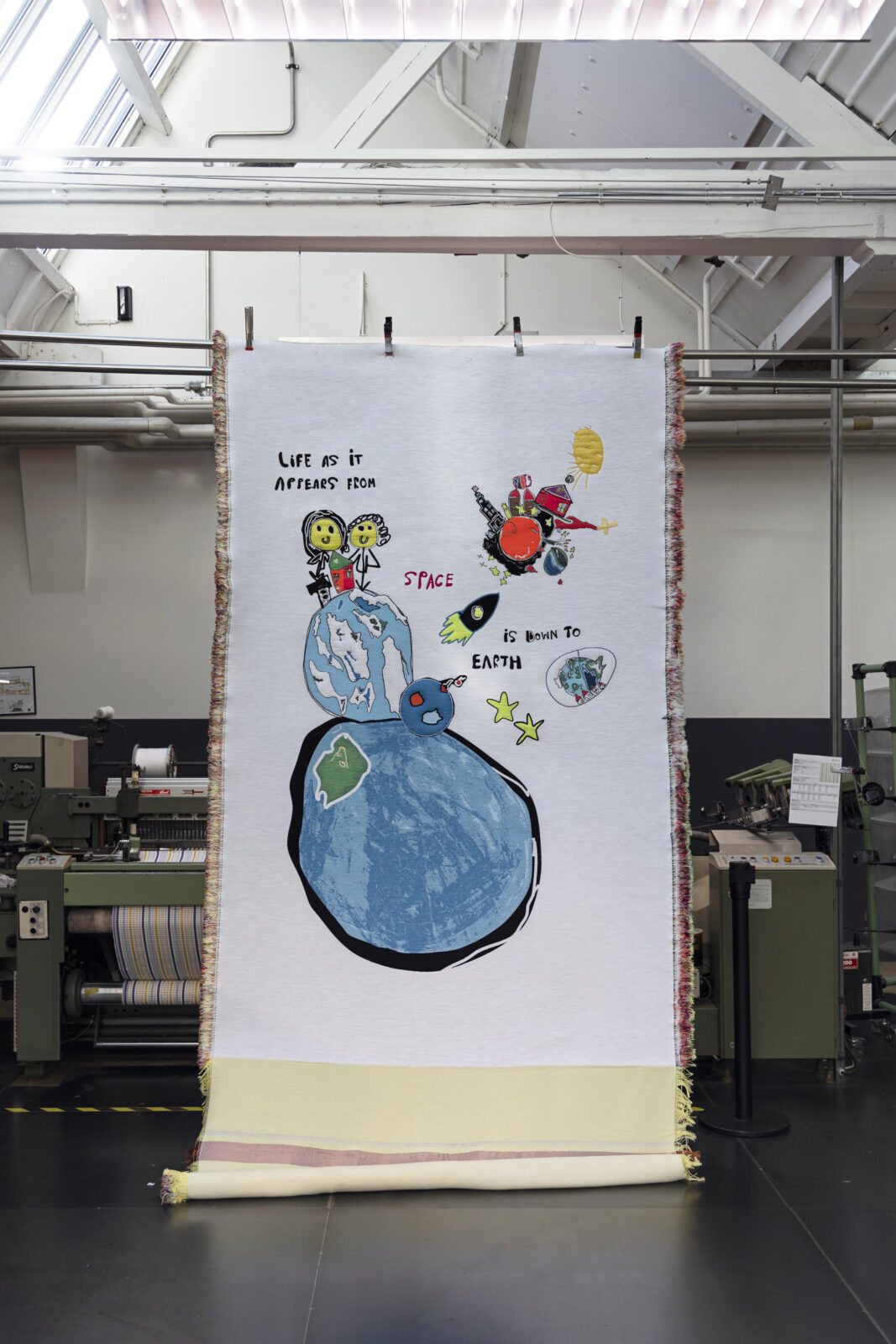 The design was a response to the attack on Israel on 7 October 2023. In a war-torn country, Nevi Pana asked primary school children to draw a future in which we are forced to leave Earth and start over on Mars. Details from 70 children’s drawings grew into a collage that sketches a pure and innocent view of this new world. When translating the drawings into vegan textiles, it was important to maintain their naivety and to avoid animal fibres. Organic cotton was chosen for the coloured images, with fluorescent yellow and orange acrylic representing the neon shades of the markers used. The white background was woven from an abaca yarn made of banana leaves. To create more depth, a filling yarn was added in certain places.