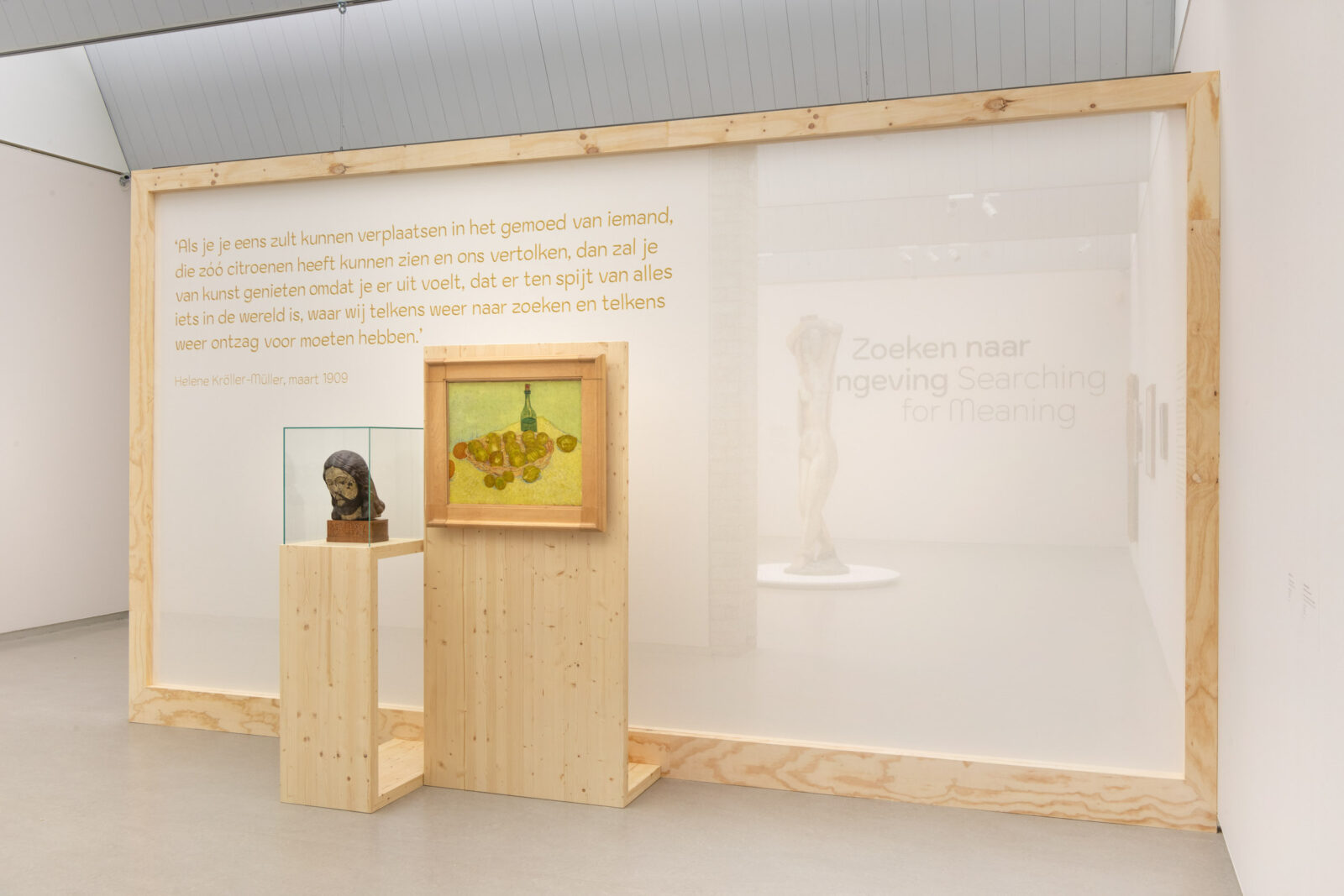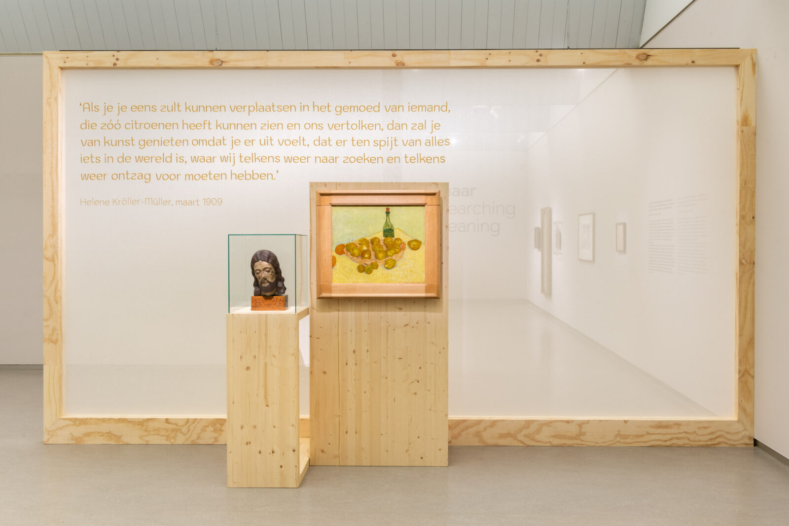 Searching for meaning was the driving force behind Helene Kröller-Müller’s personal life and her collection. The exhibition of the same name, which runs in the Kröller-Müller Museum until 11 May 2025, follows her journey as she encounters artists and movements, philosophy and spirituality. Specially for this exhibition, exhibition designer Lies Willers asked the TextielLab to embroider a quote by Helene Kröller-Müller on a room divider that stands behind a painting by Van Gogh. It reads: ‘If you can put yourself in the mind of someone who was able to see lemons and interpret them for us in such a way, then you will enjoy art because you will feel that, despite everything, there is something in the world that we are always searching for and for which we should always have respect.’