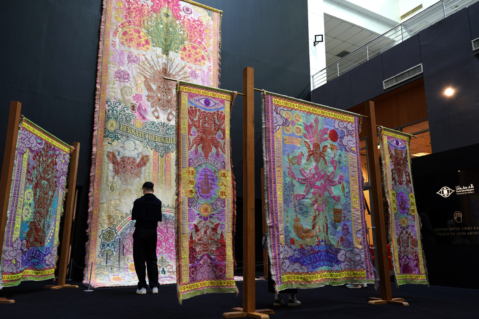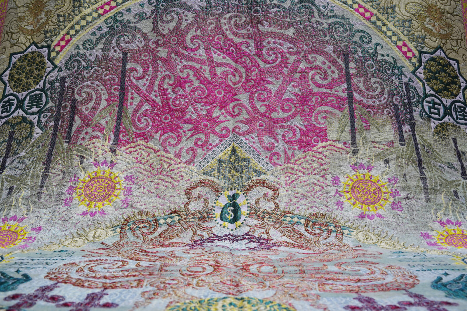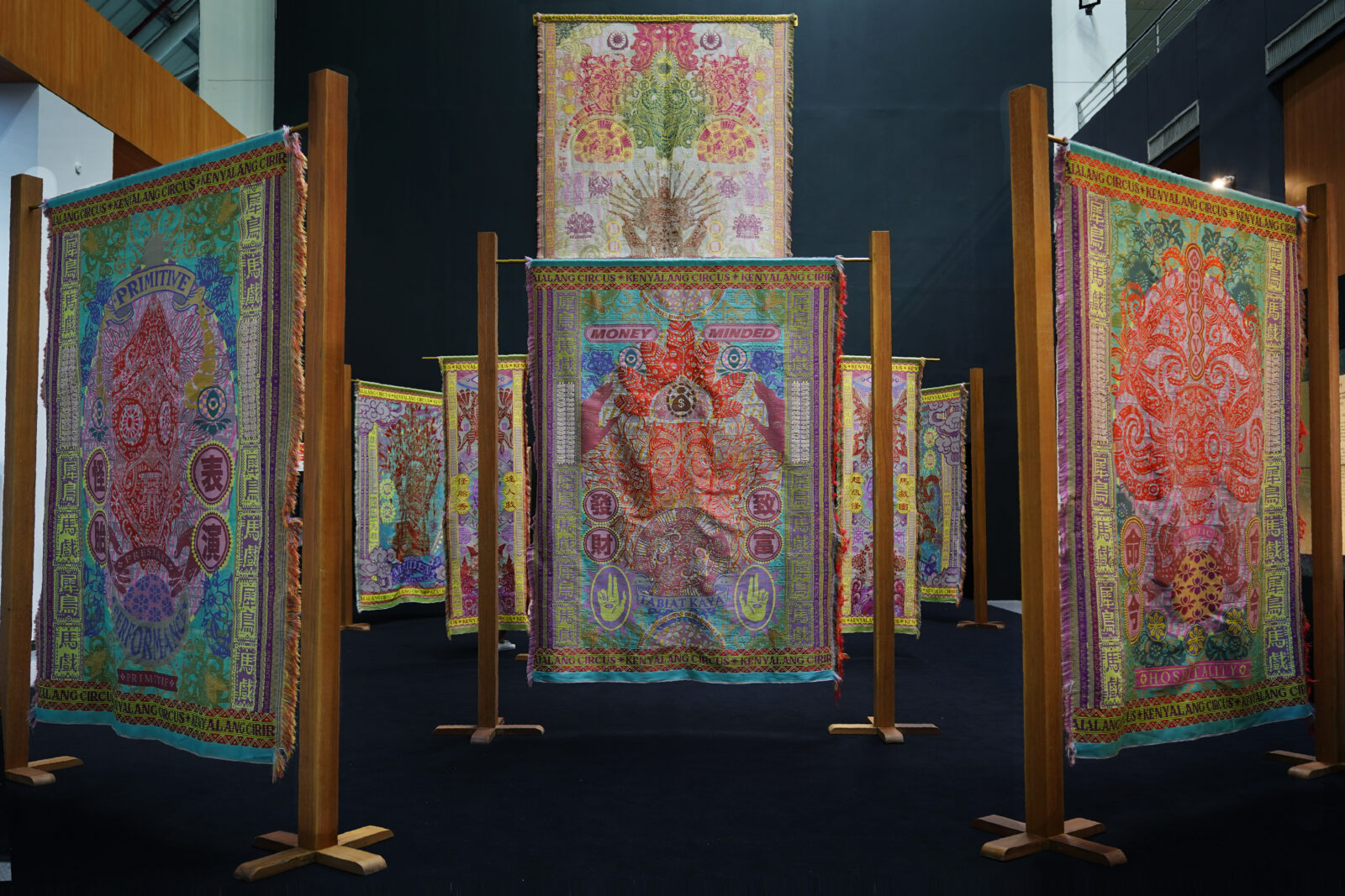 Marcos Kueh graduated from the KABK in The Hague in 2022 with a large tapestry he produced in the TextielLab. The tapestry is part of the ongoing Kenyalang Circus series. In it, Kueh wrestles with pressing questions about his identity as a Chinese Malaysian from Borneo who in Europe is regarded as ‘exotic’. His graduation project won the Ron Mandos Young Blood Award and was acquired by Museum Voorlinden. After being selected to participate in the TextielLab’s Advanced Textile Program in 2023, Kueh returned to the lab in 2024 to develop a new work in the series. Measuring some 10 metres high and almost 3.5 metres wide, it is his largest tapestry to date.
