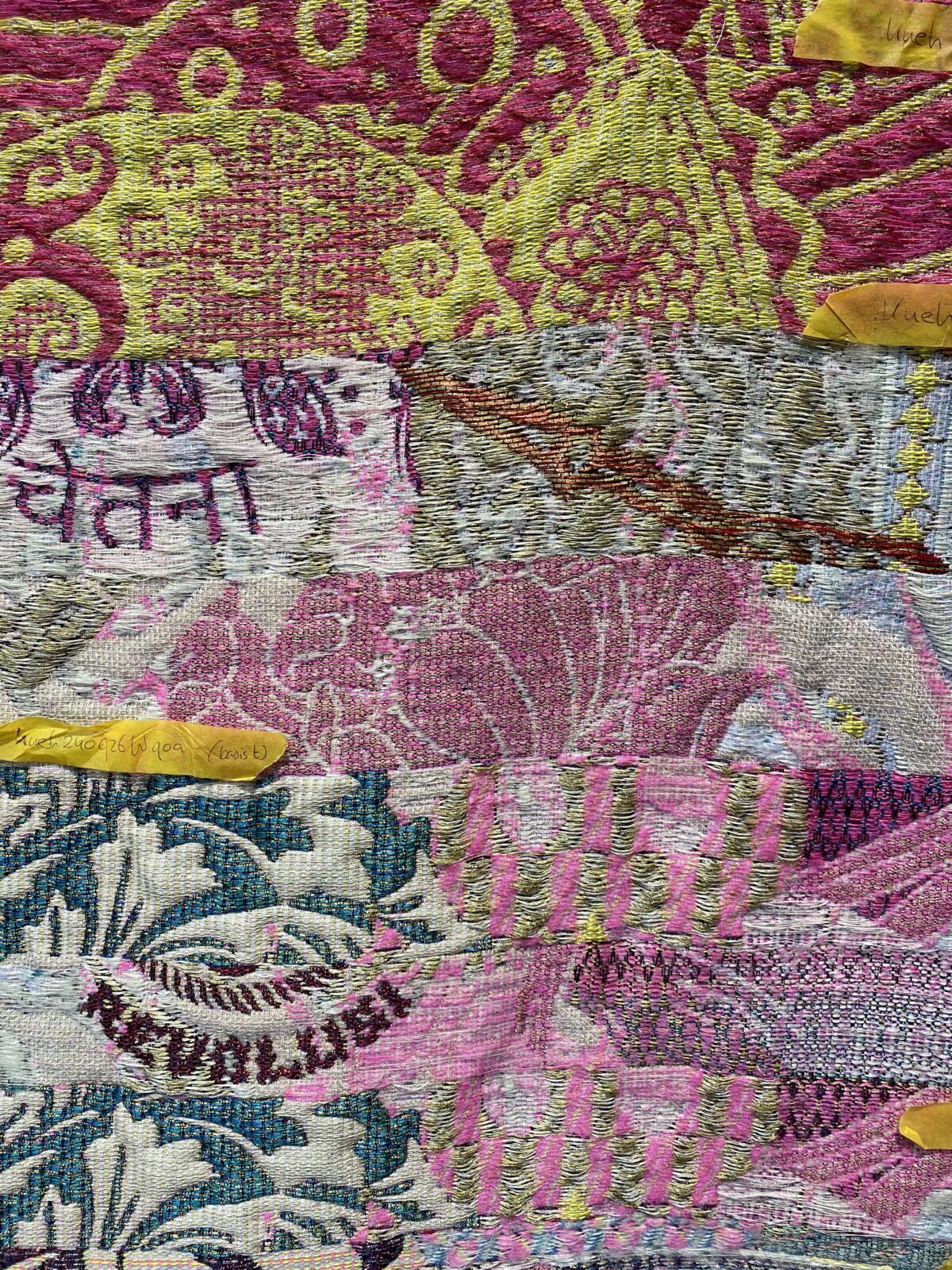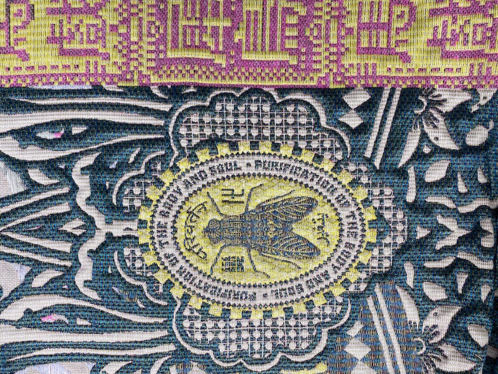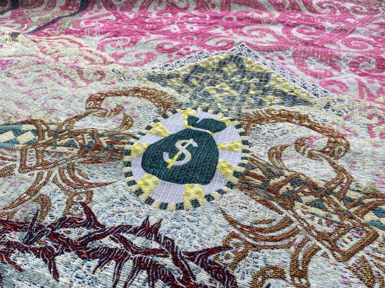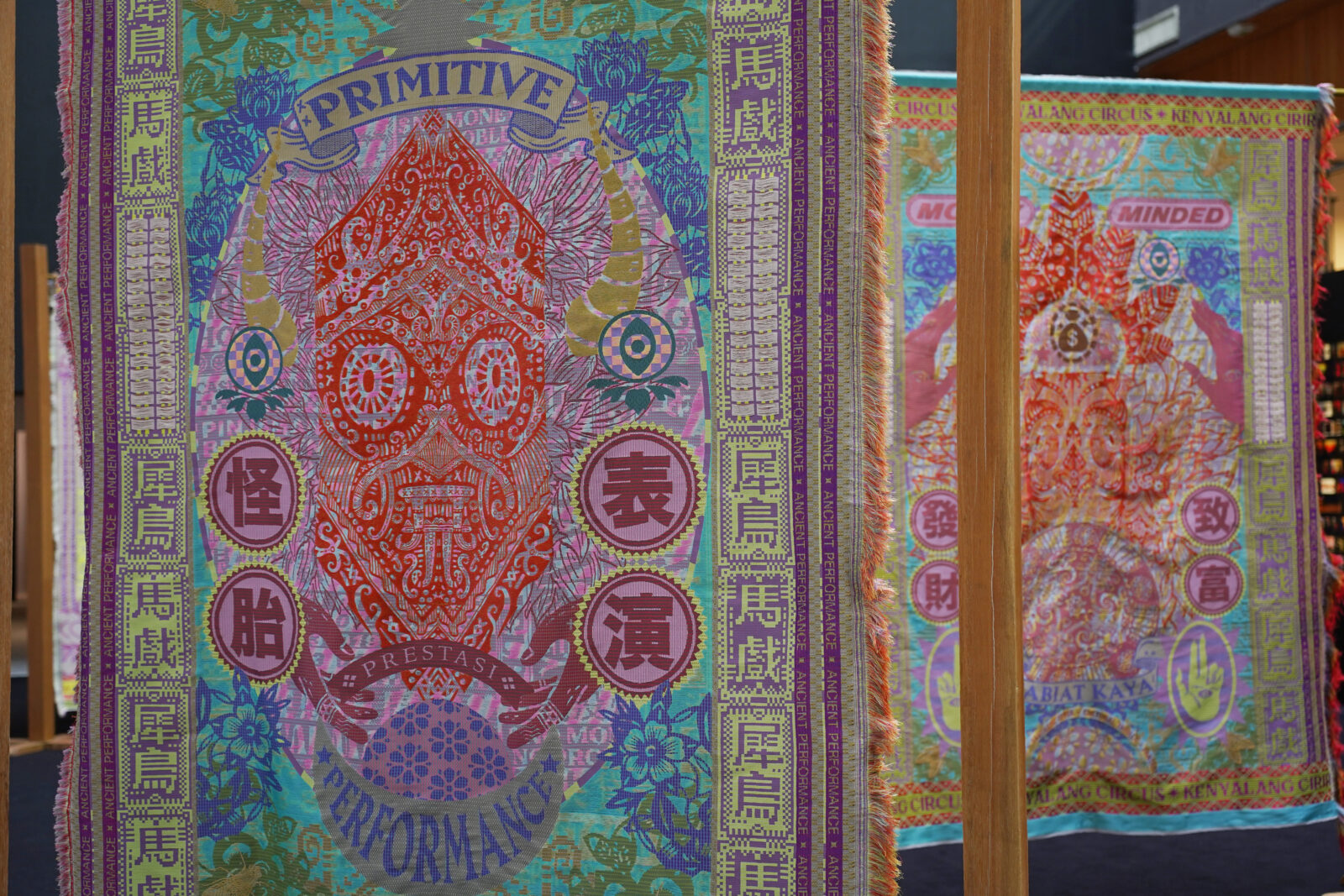 There is a lot going on in this gigantic woven fabric. It once again satirises the circus surrounding the misunderstood cultures of Borneo, with a mix of traditional masks and the lyrics of the state anthem of Sarawak as exotic entertainment. The tapestry is made of abaca, cotton and mohair and includes several twisted/twined yarns. An experienced weaver, Kueh designed his own weaves, which he tested and adjusted in the lab with product developer Marjan van Oeffelt. This resulted in a signature style. The tapestry can be seen in the National Visual Arts Gallery in Kua la Lumpur until March 2025.