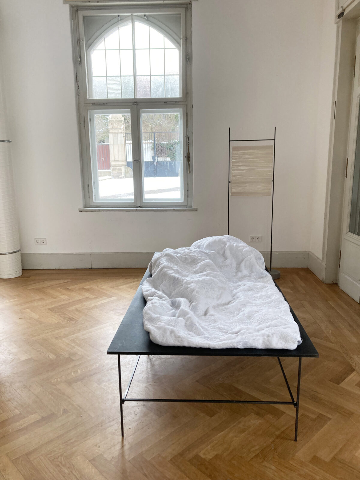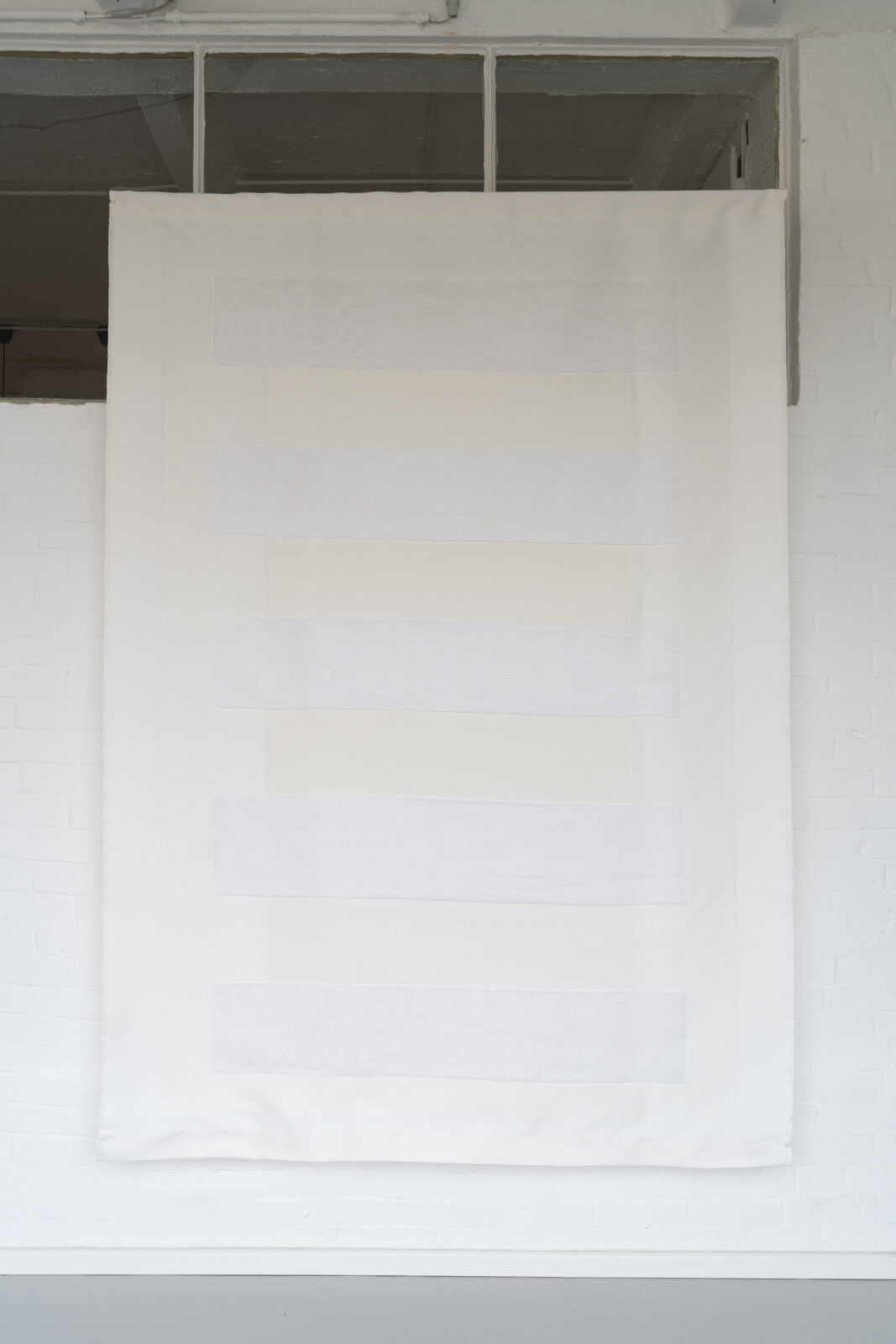 Mia Kugelmann came to Tilburg to research her master’s thesis ‘Die Farbe Weiß? Beginn einer Enzyklopädie’. With the TextielLab’s Lotte van Dijk, she wove two fabrics that showcase the many different shades of white by playing with textile techniques and materials. The work titled Albers refers to the ideas of the famous artist couple Josef and Anni Albers and combines sleek outlines and bands of colour on the one hand with surprisingly playful layers on the other. To achieve this, four white wefts of linen, paper and viscose bast were used; the different shades fade as the layers increase.