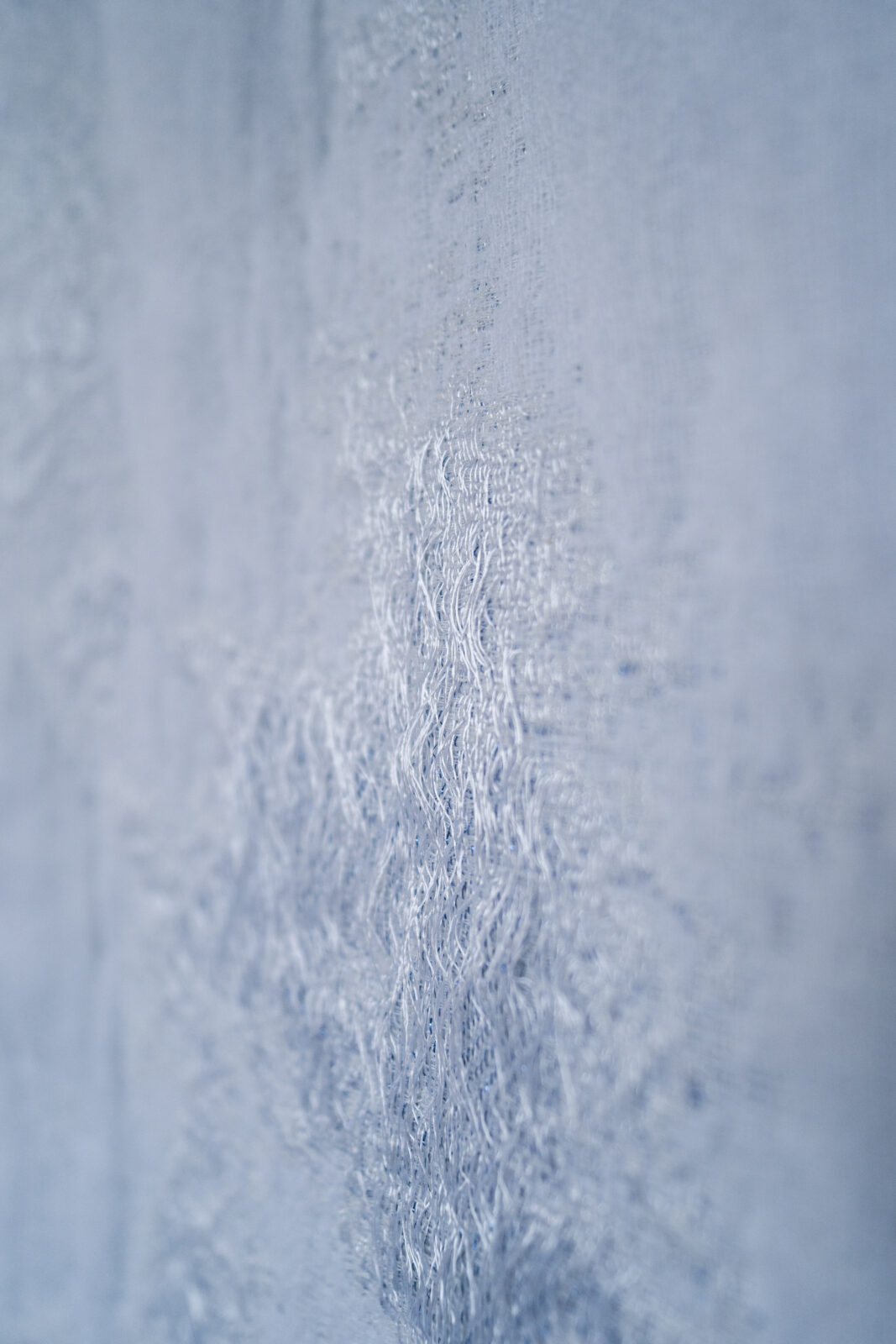 Snow is a woven landscape that aims to capture the multifaceted appearance of snow. Six white wefts and one thin blue lurex thread create a tactile fabric that plays with loose structures, floats and varying thickness. The yarns used all produce a different effect: hairy mohair, soft merino wool, shiny lurex, metallic techno yarn and a glossy raffia-like viscose. A heat-sensitive filling yarn woven into the fabric created a puffy effect when it was steamed.