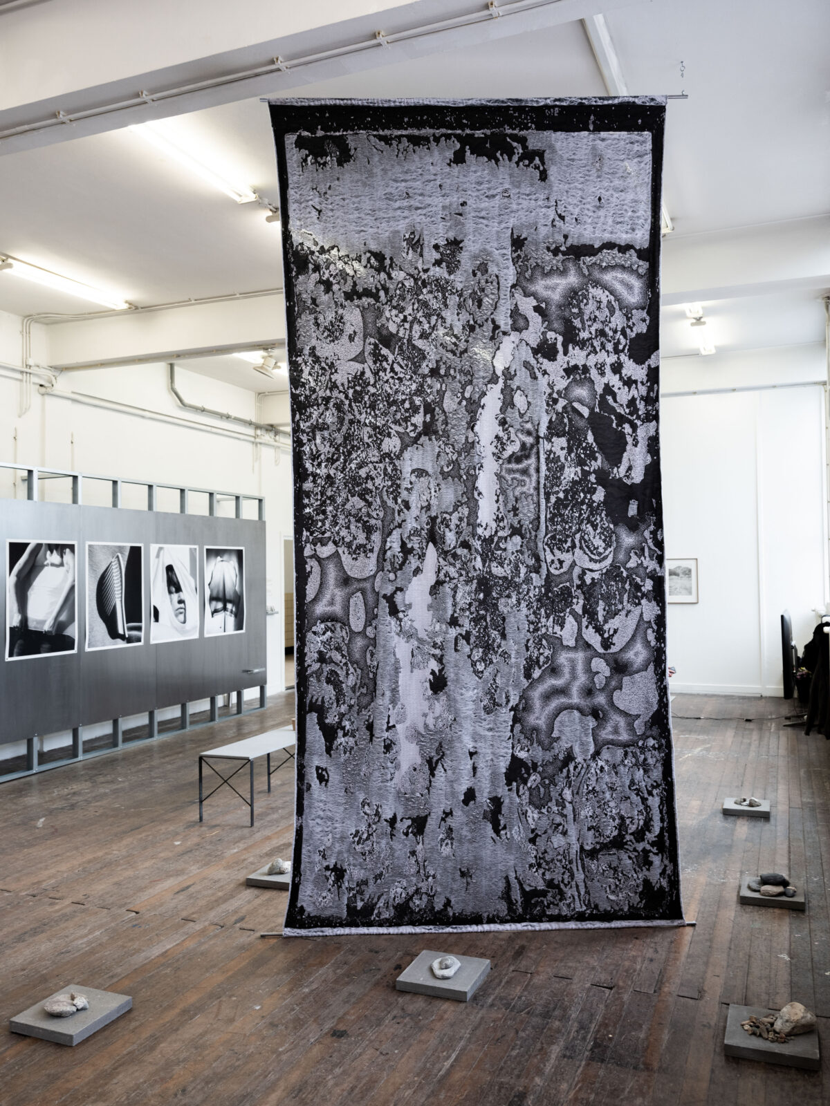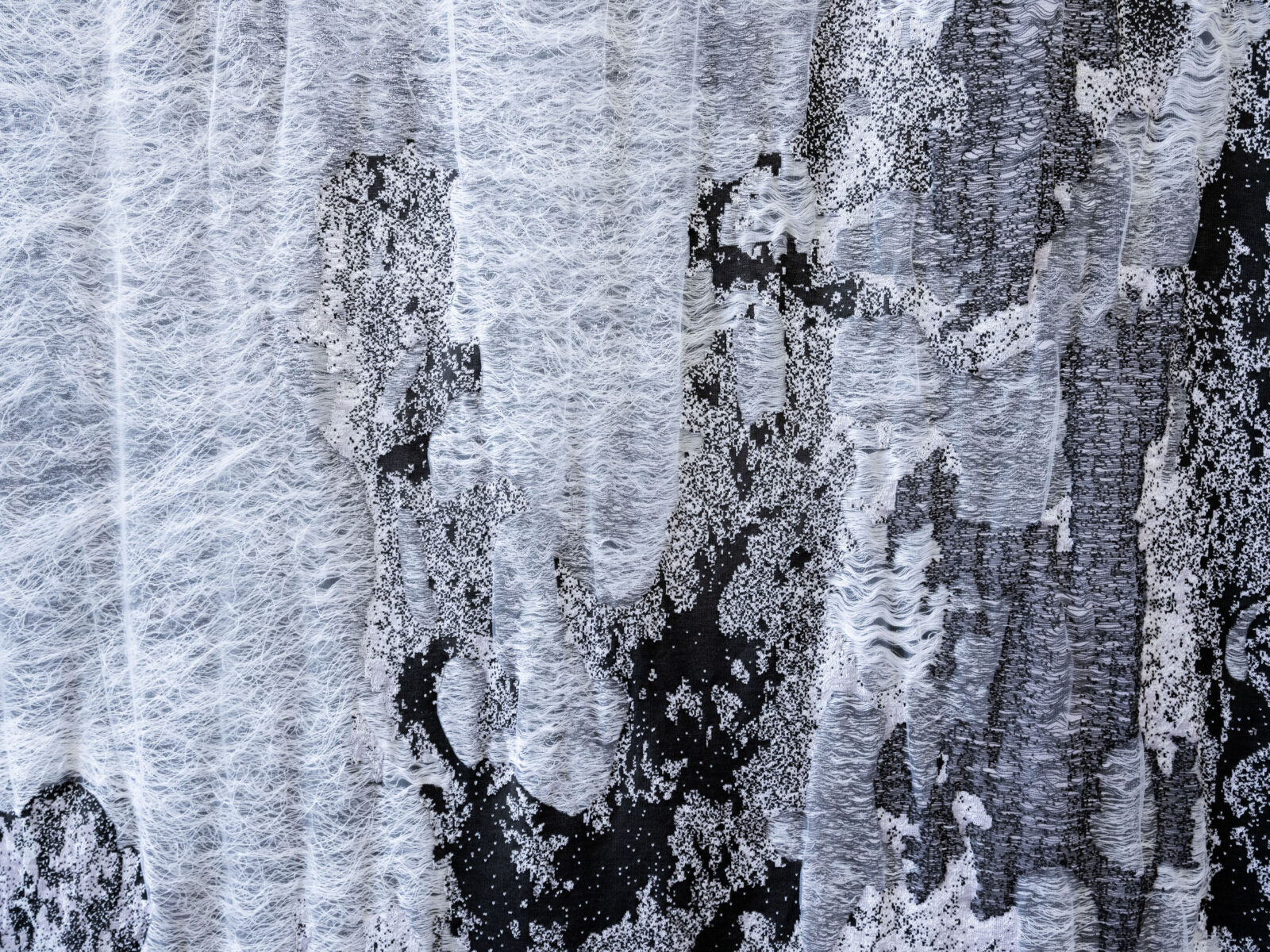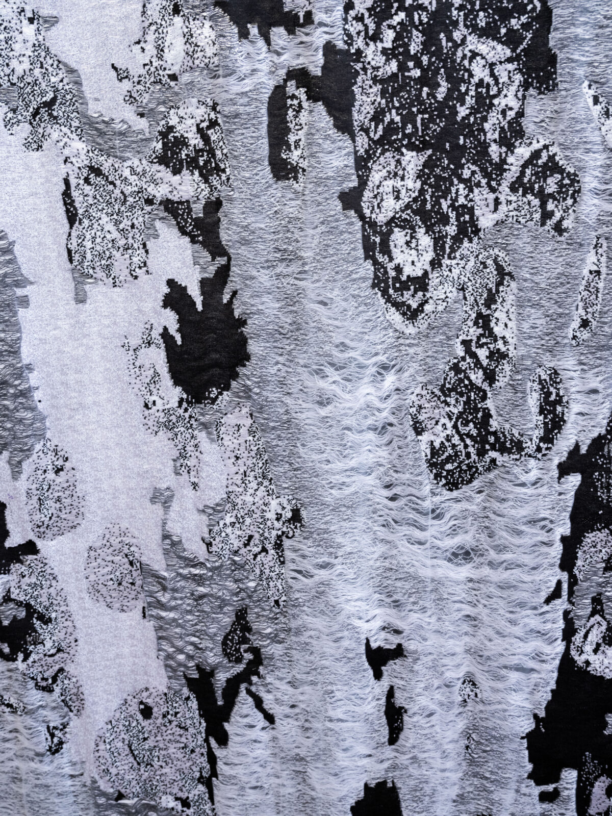 Swiss Indonesian artist Miranda Devita Kistler graduated from the KABK in The Hague with Batu dan banjir (Stone and blood), a project in which photography plays a major role. For this crossover between photography and textiles, she worked with product developer Yani Chuang on the circular knitting machine. Together, they converted an old, water-damaged photo of Devita Kistler’s grandmother in Indonesia into a knitted tapestry. The photo has run and faded, and the image is covered with water stains. These details were carefully incorporated into the fabric using polyester monofilament and long floats.