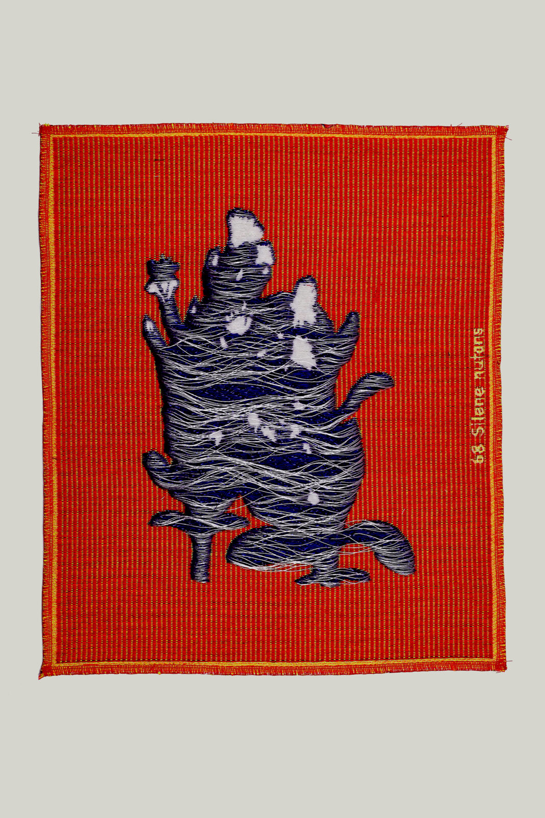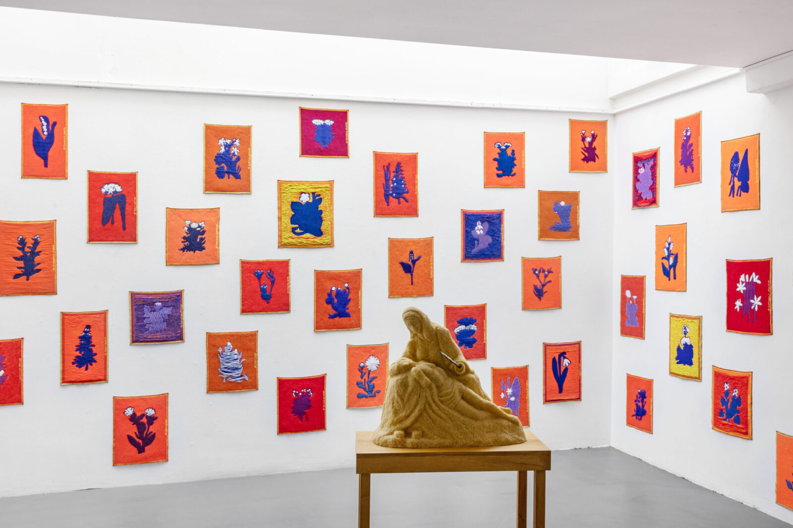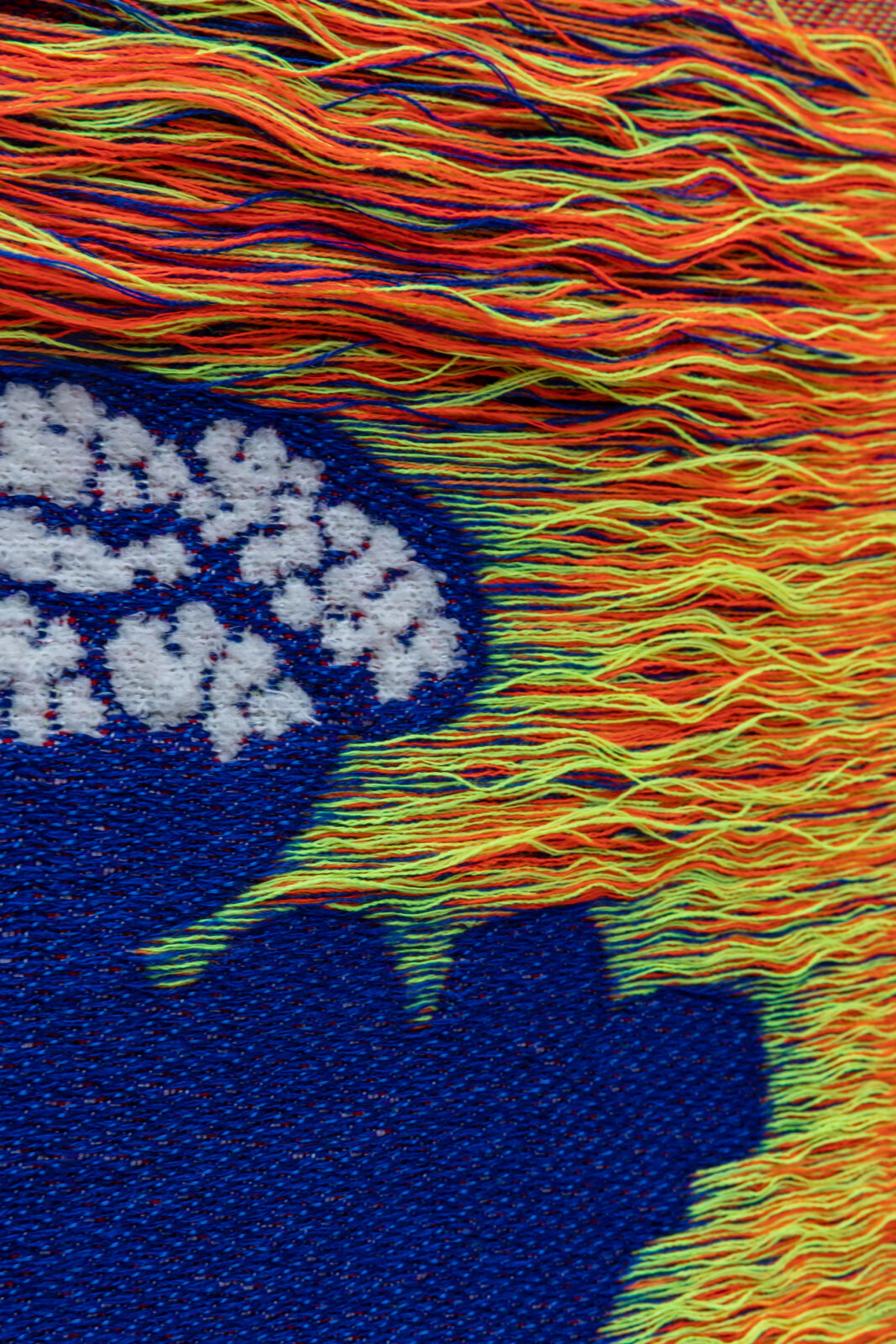The installation is an artistic exploration of the concepts of absence and loss in relation to ethics and politics. Hurkmans combines the colourful floral motifs with the Pietà theme to investigate the disruption of human values and natural harmony. The designs all share the same palette but are woven in a different mix of yarns and weaves to emphasise the uniqueness of each flower.