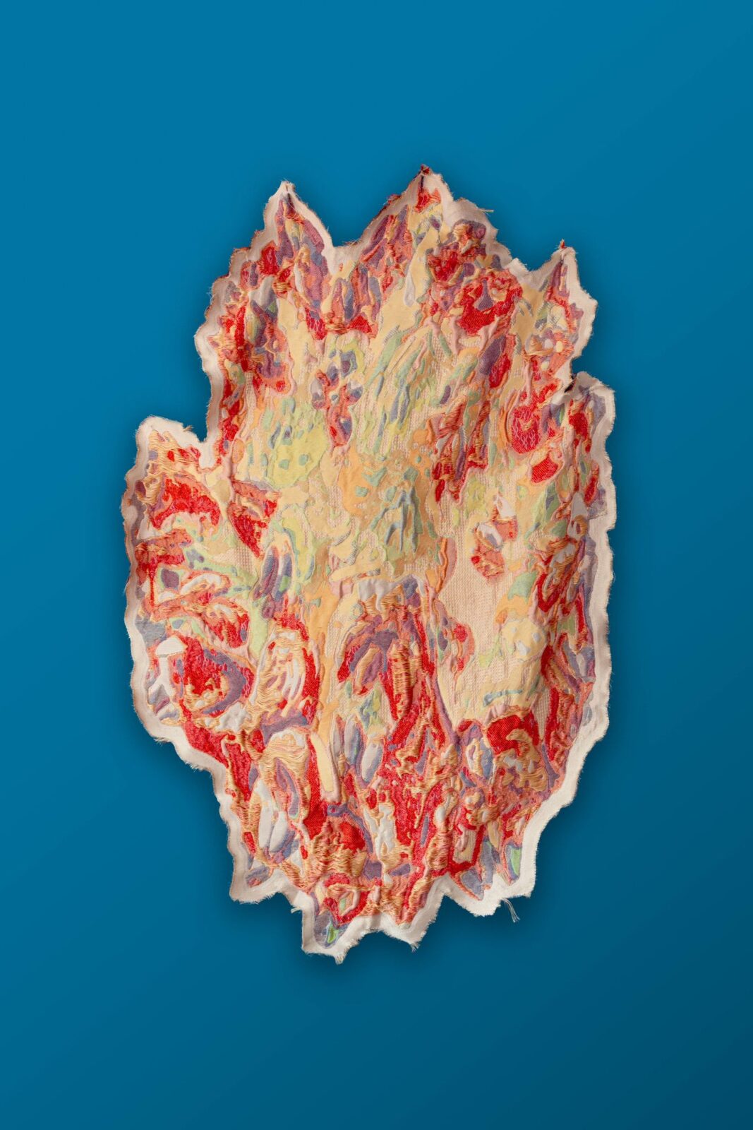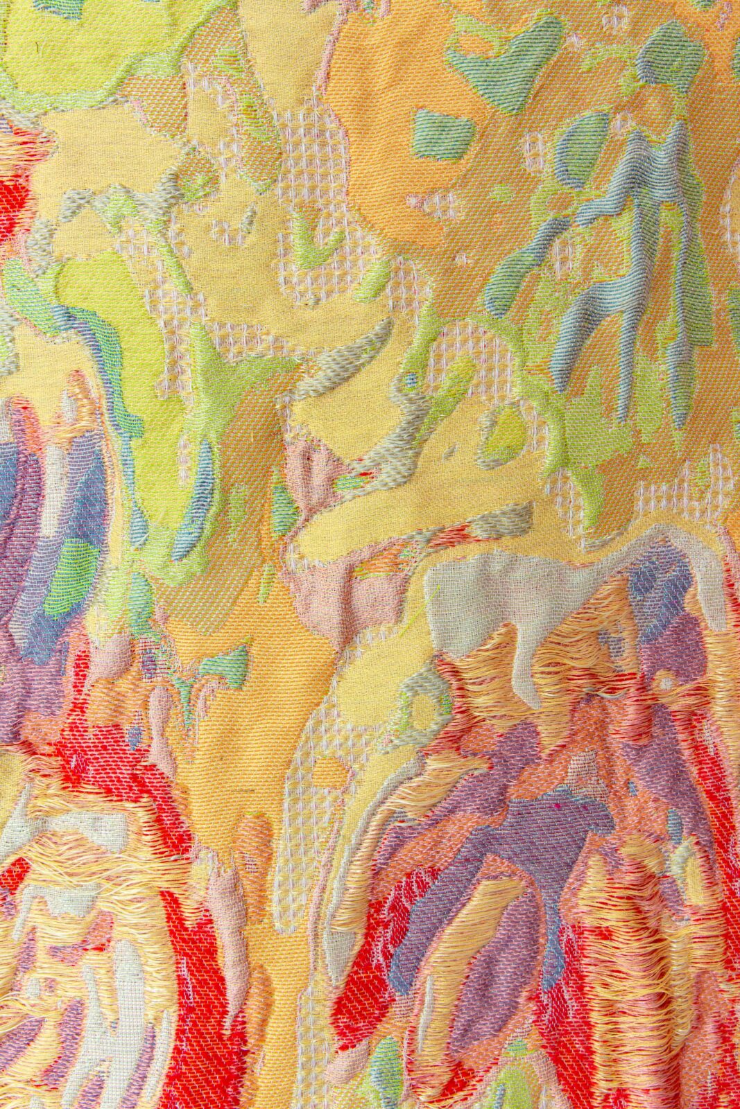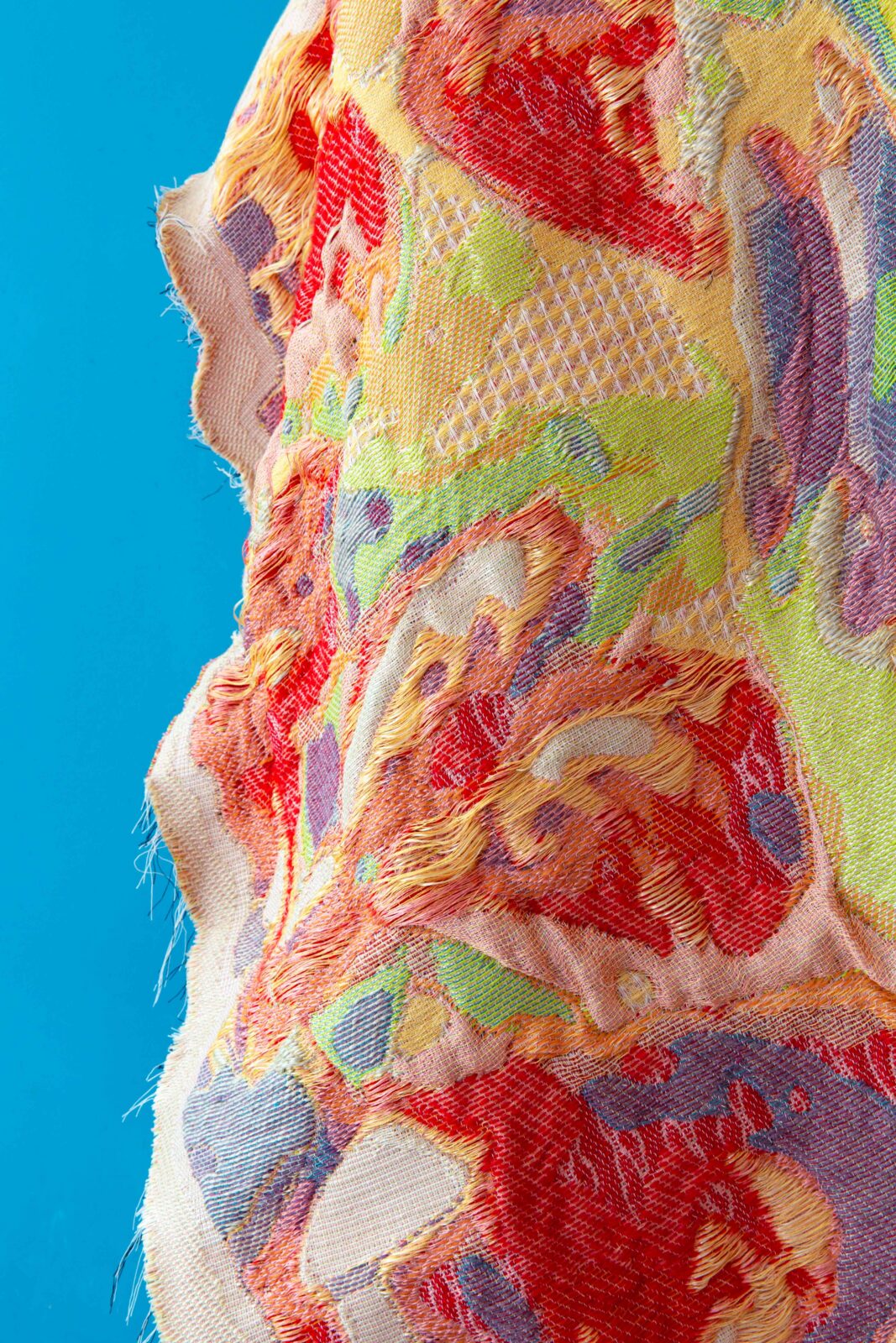 For this substantial piece, she experimented with organic shapes and coarse structures. She used large weaves and numerous loose floats in a mix of Wolkat yarns, deadstock yarns and recycled PET yarns. After the fabric was removed from the loom, she cut around the design to create a whimsical, irregular outline. To exhibit the work, Keja Planken developed her own concept called Salon H-ome. During Amsterdam Art Week, she invited the public into her home to share her work in an intimate setting. In the summer of 2024, the tapestry was also shown at Cocoon Collectables’ Summer Salon.