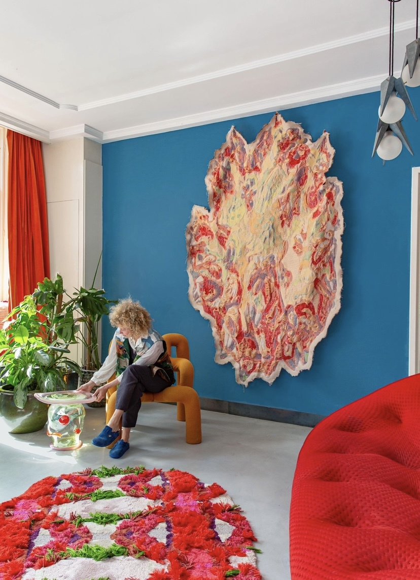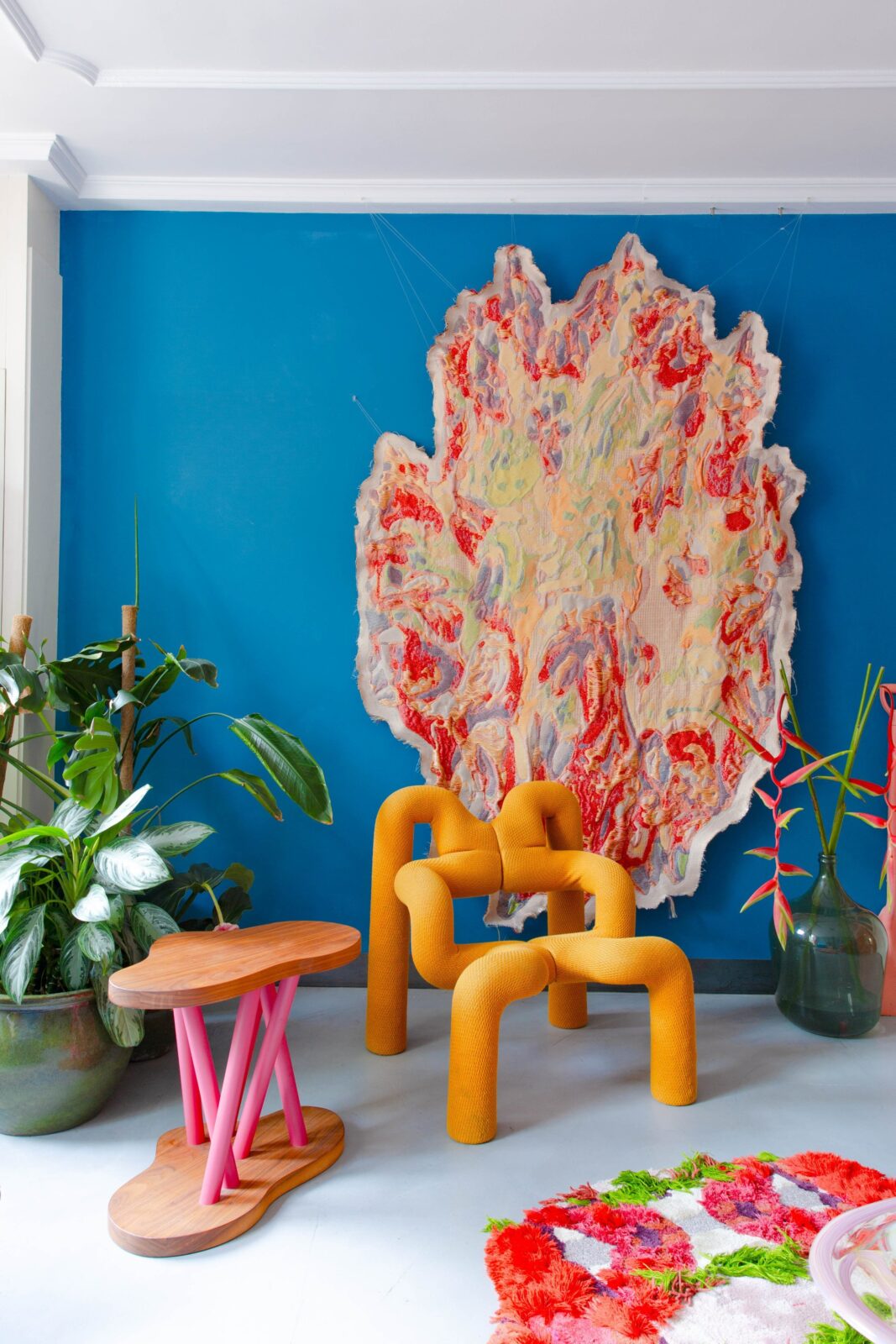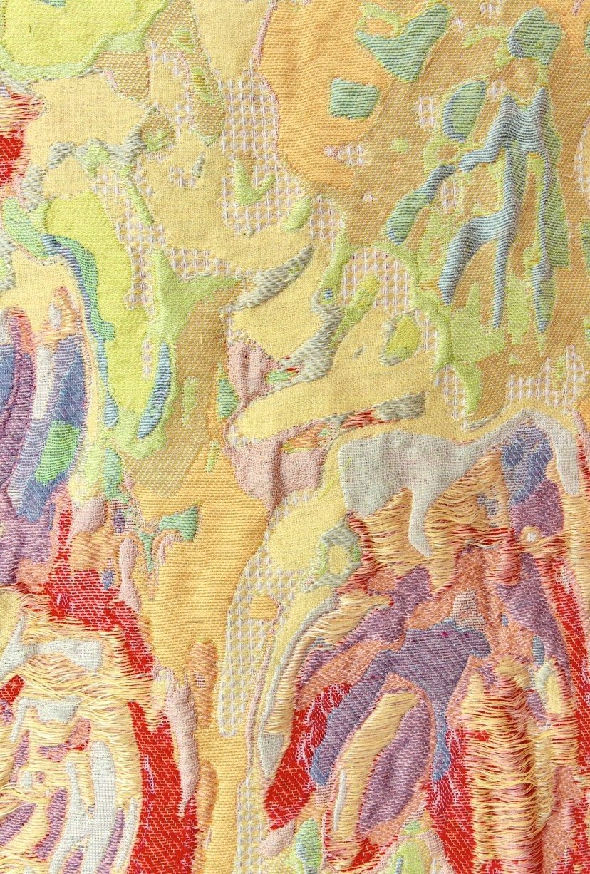 For this substantial piece, she experimented with organic shapes and coarse structures. She used large weaves and numerous loose floats in a mix of Wolkat yarns, deadstock yarns and recycled PET yarns. After the fabric was removed from the loom, she cut around the design to create a whimsical, irregular outline. To exhibit the work, Keja Planken developed her own concept called Salon H-ome. During Amsterdam Art Week, she invited the public into her home to share her work in an intimate setting. In the summer of 2024, the tapestry was also shown at Cocoon Collectables’ Summer Salon.