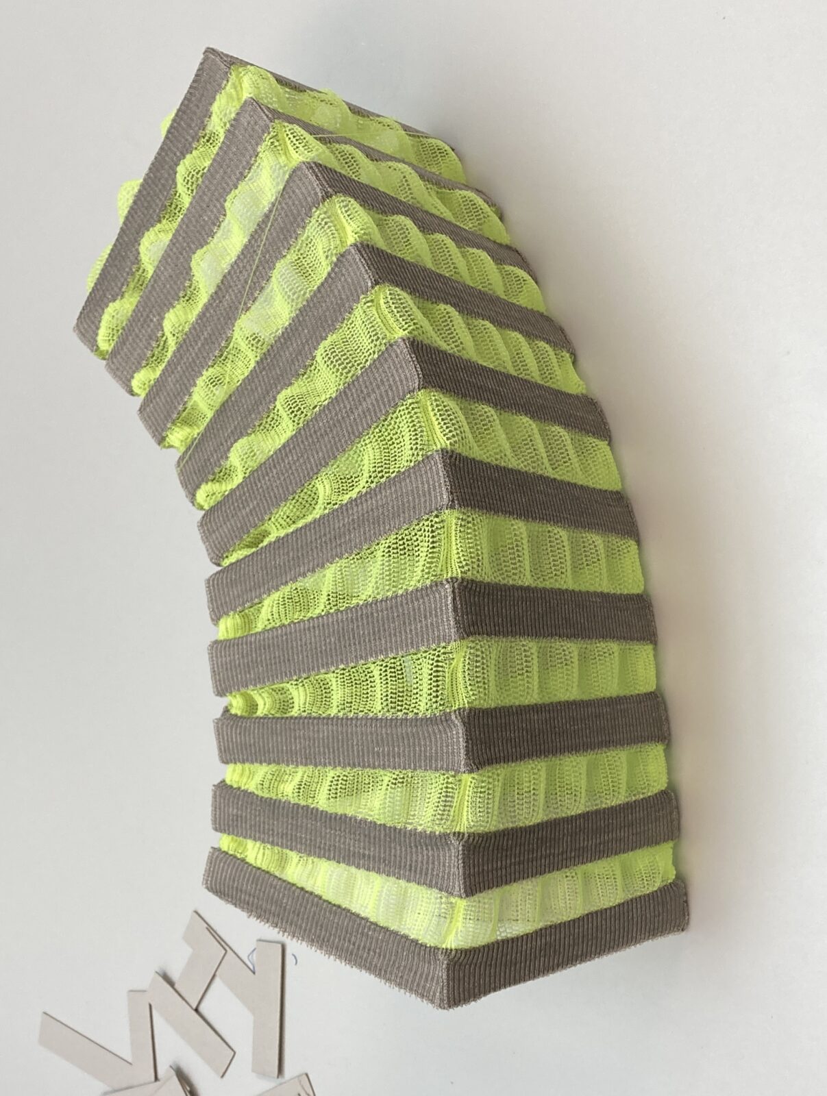 In the TextielLab, she made two knitted structures from a mix of linen, elastic and polyester monofilament. The works were made on the flat knitting machine, but when folded along pieces of cardboard incorporated in the fabric, they became three dimensional. The advantage of these types of knitted walls or pillars is that they are lightweight, breathable, flexible and adaptable. This allows them to respond to environmental factors such as light and air. Following the ArtEZ graduation show, the pieces were also shown at INNOVATE Experience 2024 in Musis Arnhem. Dam is currently researching alternative fillings for the tunnels, such as inflatables or sensors, which will extend the possibilities in terms of form and function.