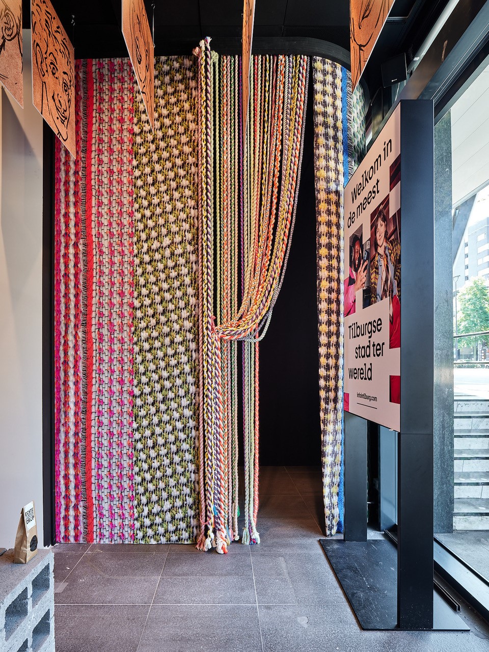In 2024, a new information point opened at Tilburg’s station. Called Info in Tilburg, the central location also sells work by local artists, including tea towels by Sigrid Calon. Calon also developed a textile installation for the information point on behalf of City Marketing. The work refers to Tilburg’s history as a textile city and to the TextielMuseum in particular.