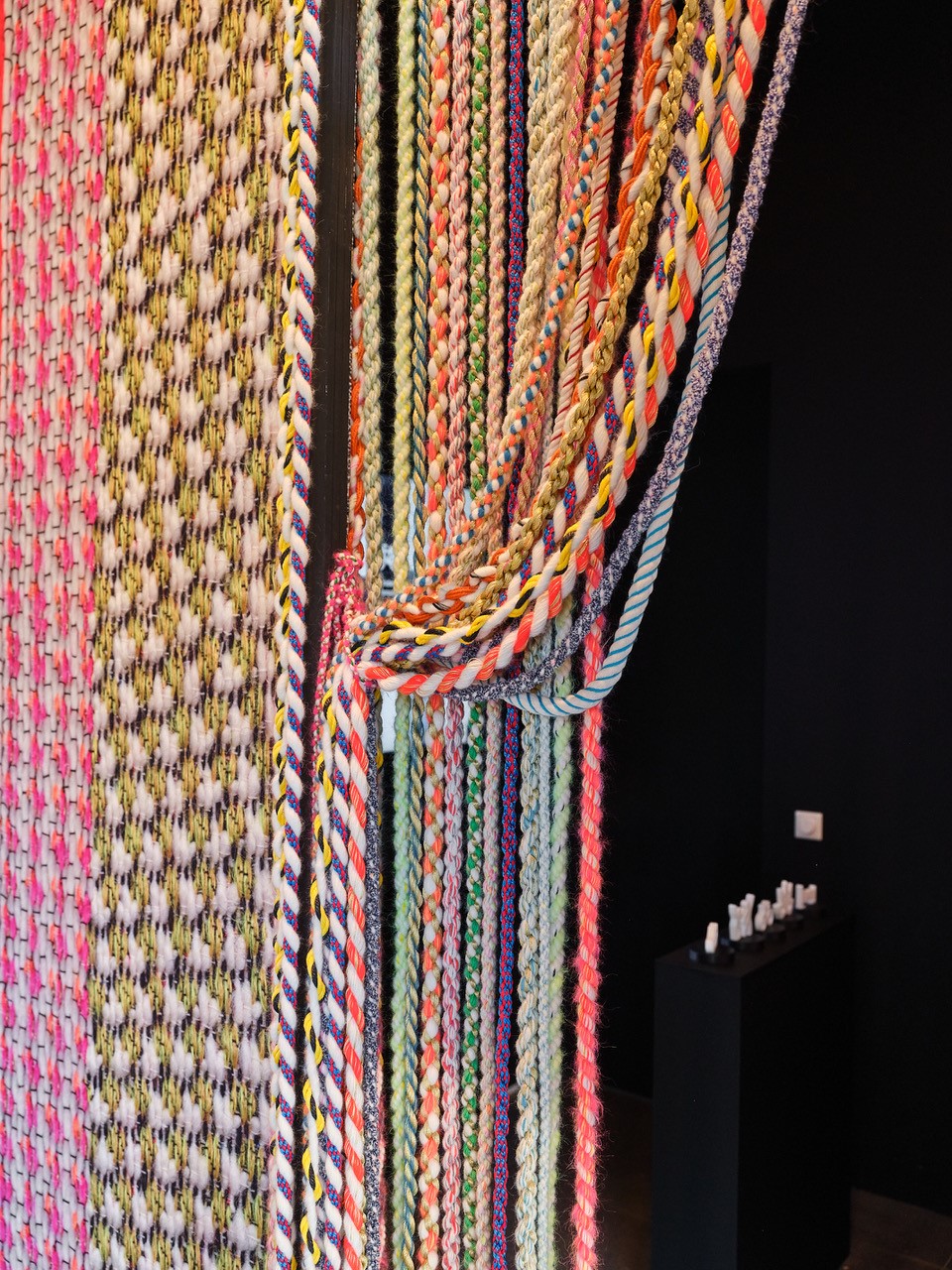 For the installation, Calon had her Woven grids digitally printed on strips of fabric and made her own version of an old-fashioned ‘fly screen’. In the TextielLab’s passementerie department, 32 unique cords were made, showing the range of possibilities of this technique. The cords are partly made from the same yarns as Calon’s new Woven grids, which were shown earlier in the year at Art Rotterdam.