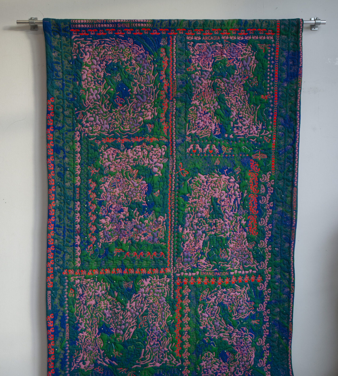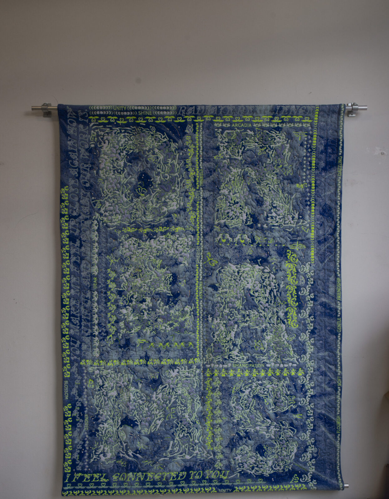 Typography and textiles meet in Dreams, a knitted tapestry measuring 250 x 170 cm. The tapestry is part of Symbols of utopia, an artistic research project by Yamuna Forzani and Céline Hurka on the empowerment of women and queers. Multidisciplinary artist and queer activist Forzani has worked in the TextielLab before, but it was a first for Hurka. A typographic designer, she investigates the cultural significance behind typefaces. With Forzani, she sifted through archives and museum collections, looking for symbolism by female makers.