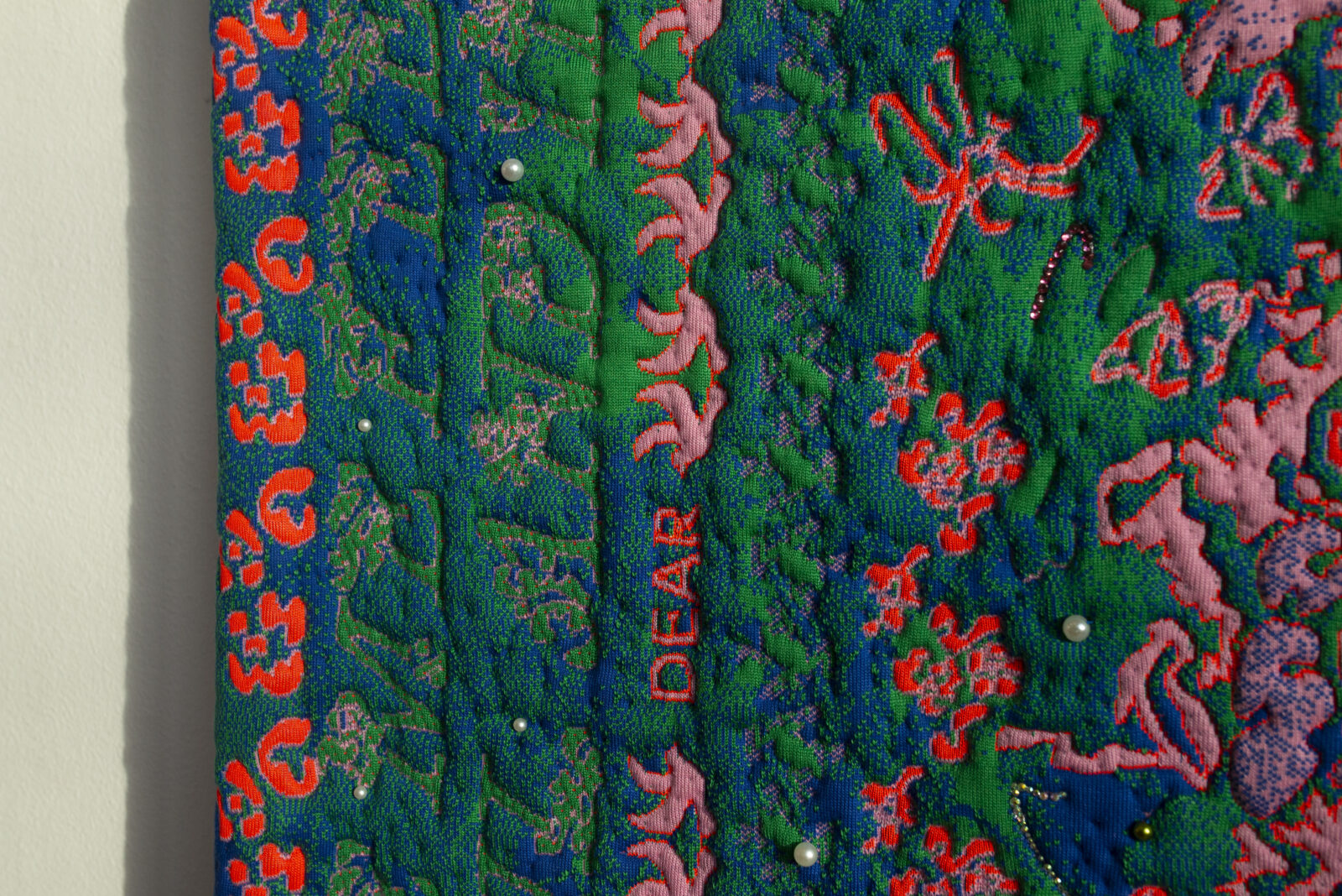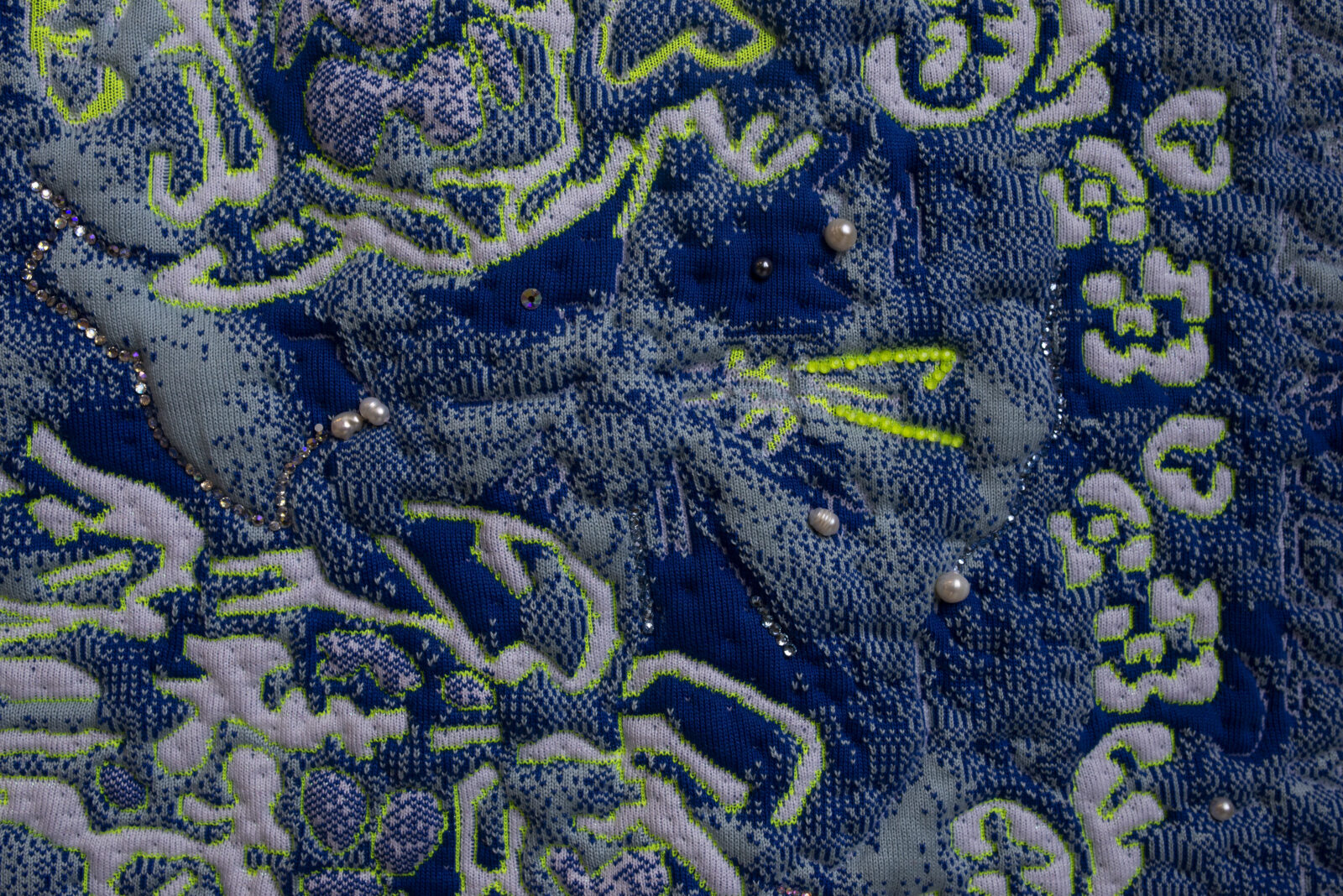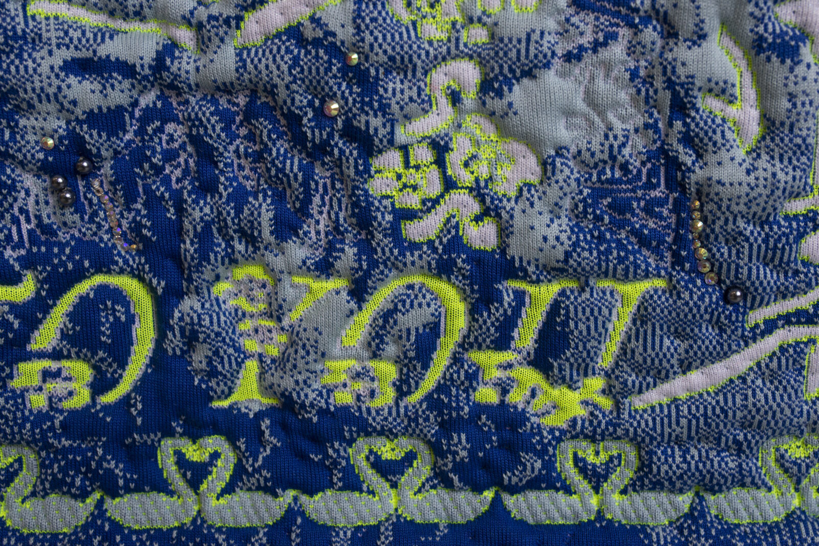 The research led them to historical objects such as embroidery samplers and banners, which were used as inspiration for new, inclusive typefaces. In the lab, the duo experimented with knitting their self-designed typefaces on the circular knitting machine, using the double cloth technique in four colours. Hurka provided the graphic precision while Forzani developed the organic shapes and colour schemes. In this tapestry, the first in a larger series, the letters of the word Dreams blur the line between typeface and image. The fabric is mostly made of organic cotton and recycled polyester. The tapestry was displayed in 2024 at Dutch Design Week in Eindhoven and at the Amsterdam Museum in the exhibition ‘Women of Amsterdam – an Ode.’