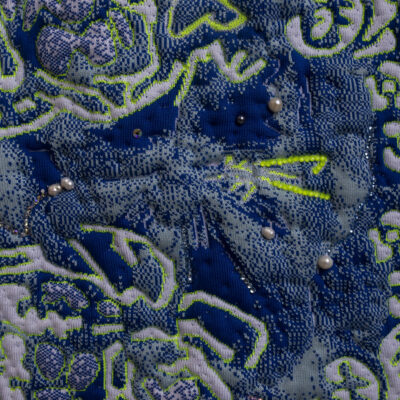 The research led them to historical objects such as embroidery samplers and banners, which were used as inspiration for new, inclusive typefaces. In the lab, the duo experimented with knitting their self-designed typefaces on the circular knitting machine, using the double cloth technique in four colours. Hurka provided the graphic precision while Forzani developed the organic shapes and colour schemes. In this tapestry, the first in a larger series, the letters of the word Dreams blur the line between typeface and image. The fabric is mostly made of organic cotton and recycled polyester. The tapestry was displayed in 2024 at Dutch Design Week in Eindhoven and at the Amsterdam Museum in the exhibition ‘Women of Amsterdam – an Ode.’